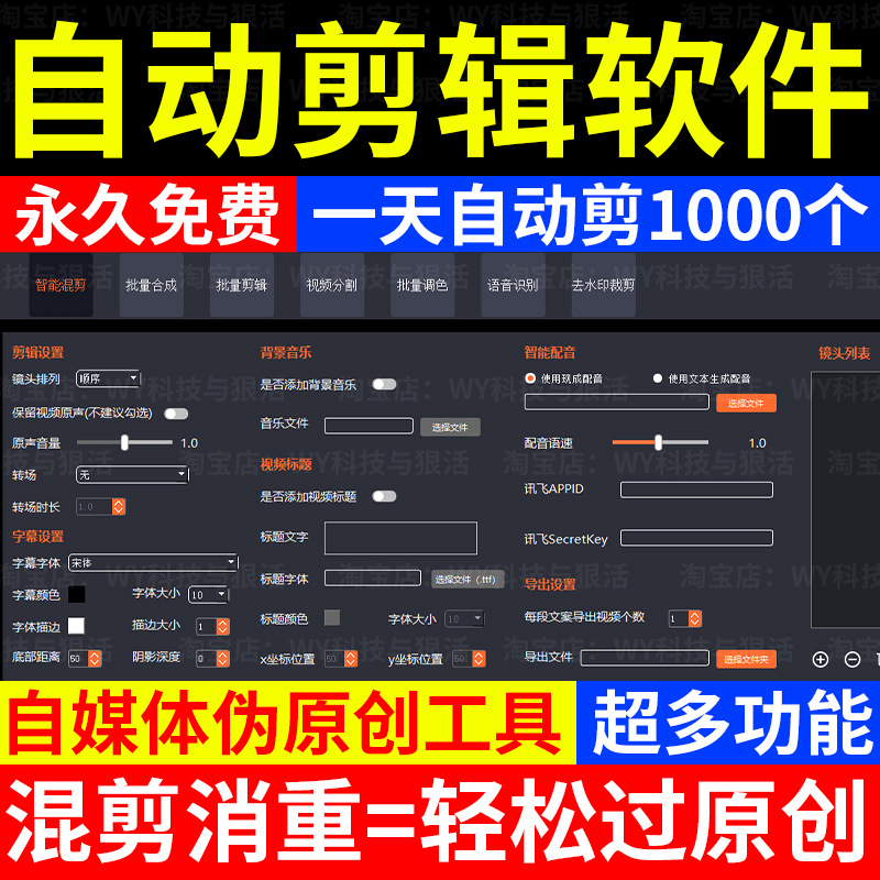 [一键剪掉片头][一键剪掉片尾][一键添加片头][一键添加片尾][一键去除水印][添加视频文字水印][添加随机背景音乐][视频自动分段][视频自动合成]更多功能请看图片
